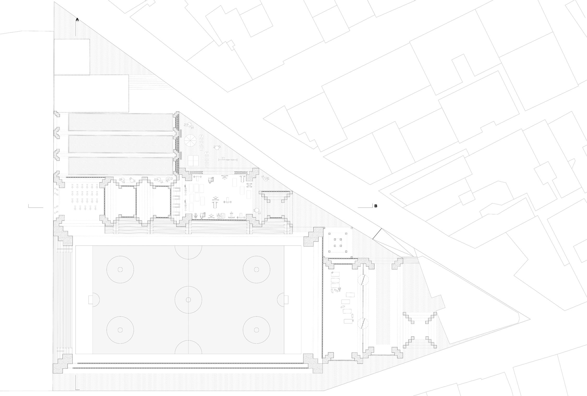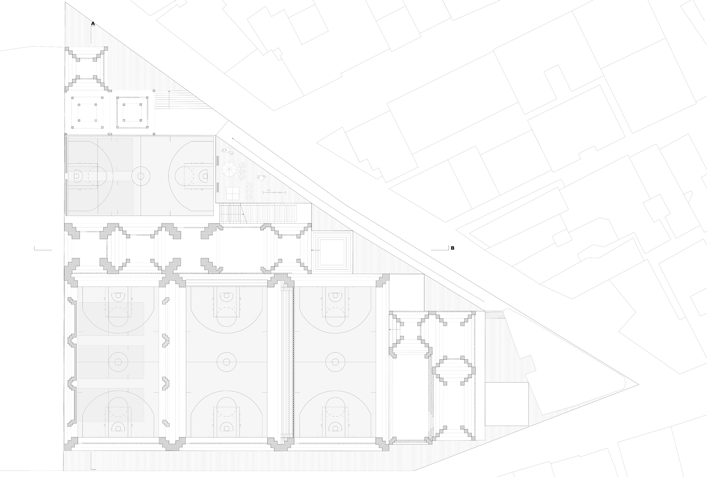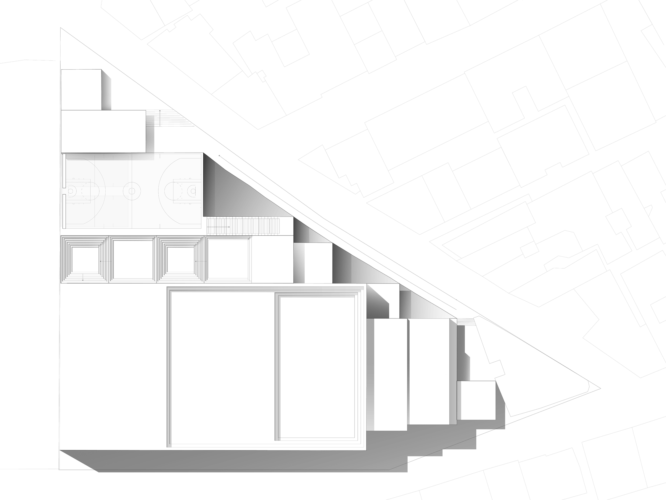 The urban sport shed is a particularly pragmatic situation that requires the creation of various environments, both interior and exterior, containing relatively homogenous functions. Beginning with a spatial bay, scaling up to long span and scaling down to occupation and ground, the limits of the original form are pushed to cater to layered program, and a triangular site. Designed like a series of nested tables, the varying density and size of the stepped legs create spaces encouraging interaction with the site and architecture. To further explore the impact of using both delicate and imposing features, layered glass brick infill act as the partitions between different bays, allowing for privacy or transparency when needed, but with a constant distortion of image, pixelated by the square panes.