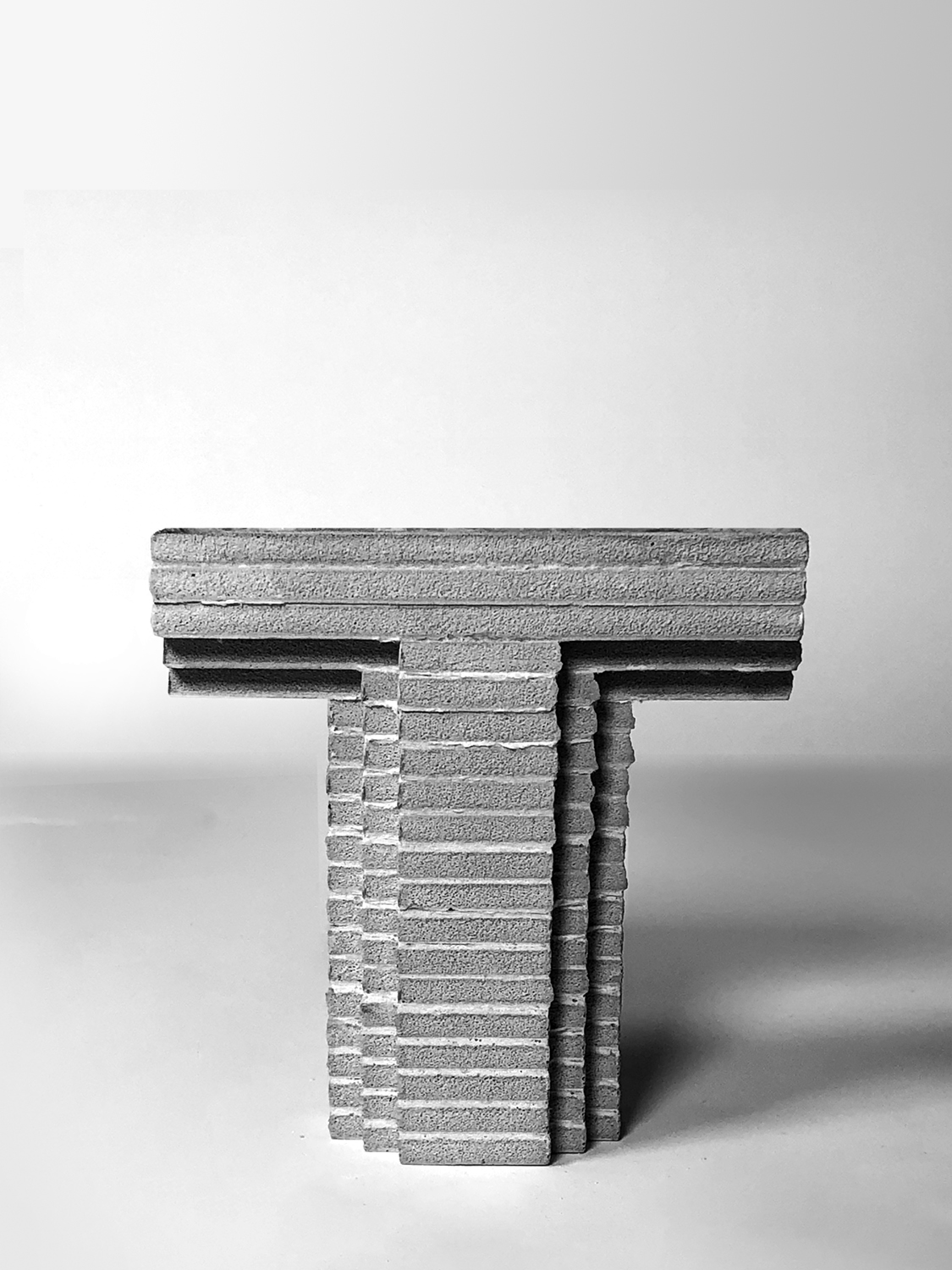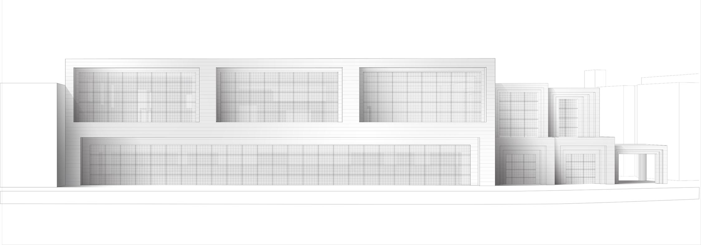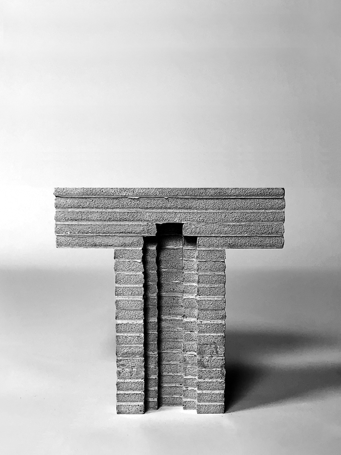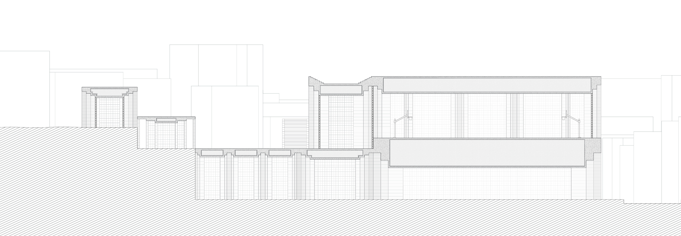The urban sport shed is a particularly pragmatic situation that requires the creation of various environments, both interior and exterior, containing relatively homogenous functions. Beginning with a spatial bay, scaling up to long span and scaling down to occupation and ground, the limits of the original form are pushed to cater to layered program, and a triangular site. Designed like a series of nested tables, the varying density and size of the stepped legs create spaces encouraging interaction with the site and architecture. To further explore the impact of using both delicate and imposing features, layered glass brick infill act as the partitions between different bays, allowing for privacy or transparency when needed, but with a constant distortion of image, pixelated by the square panes.