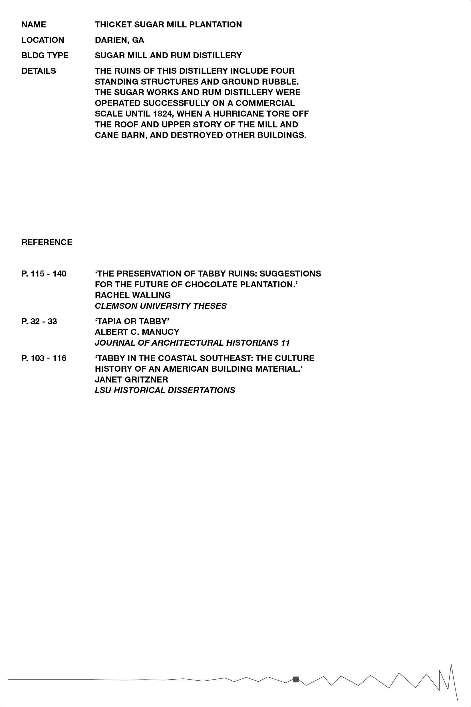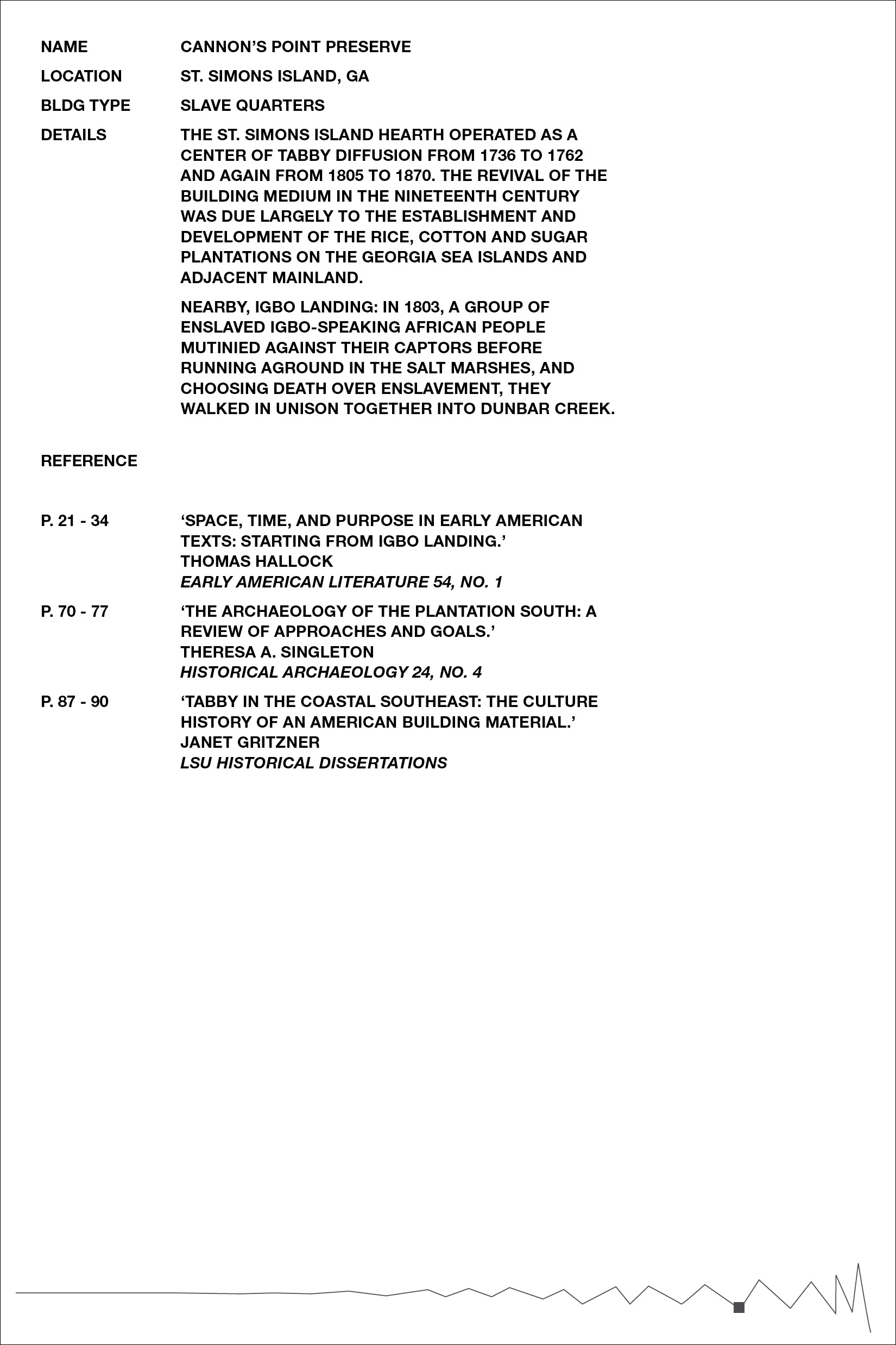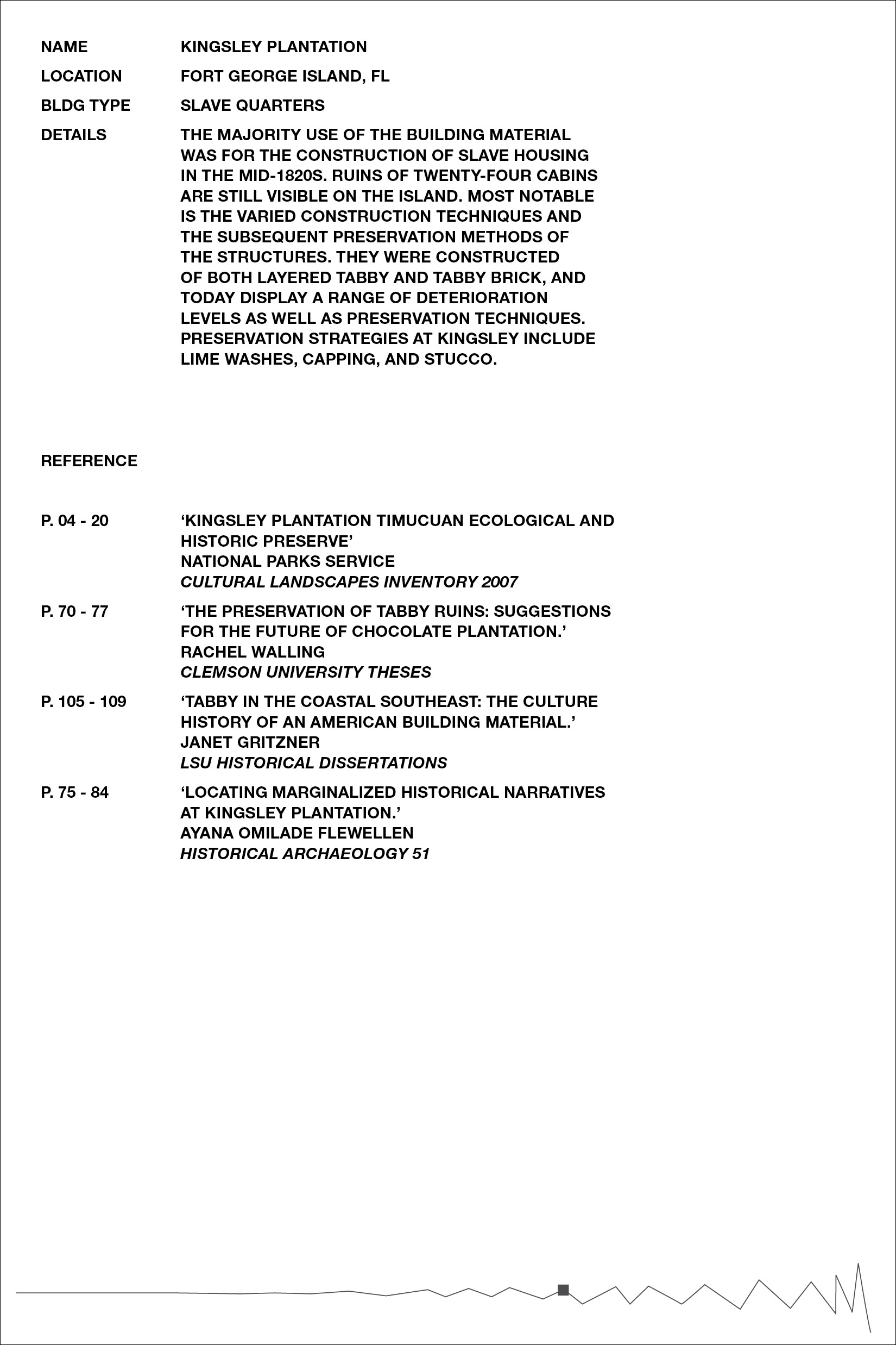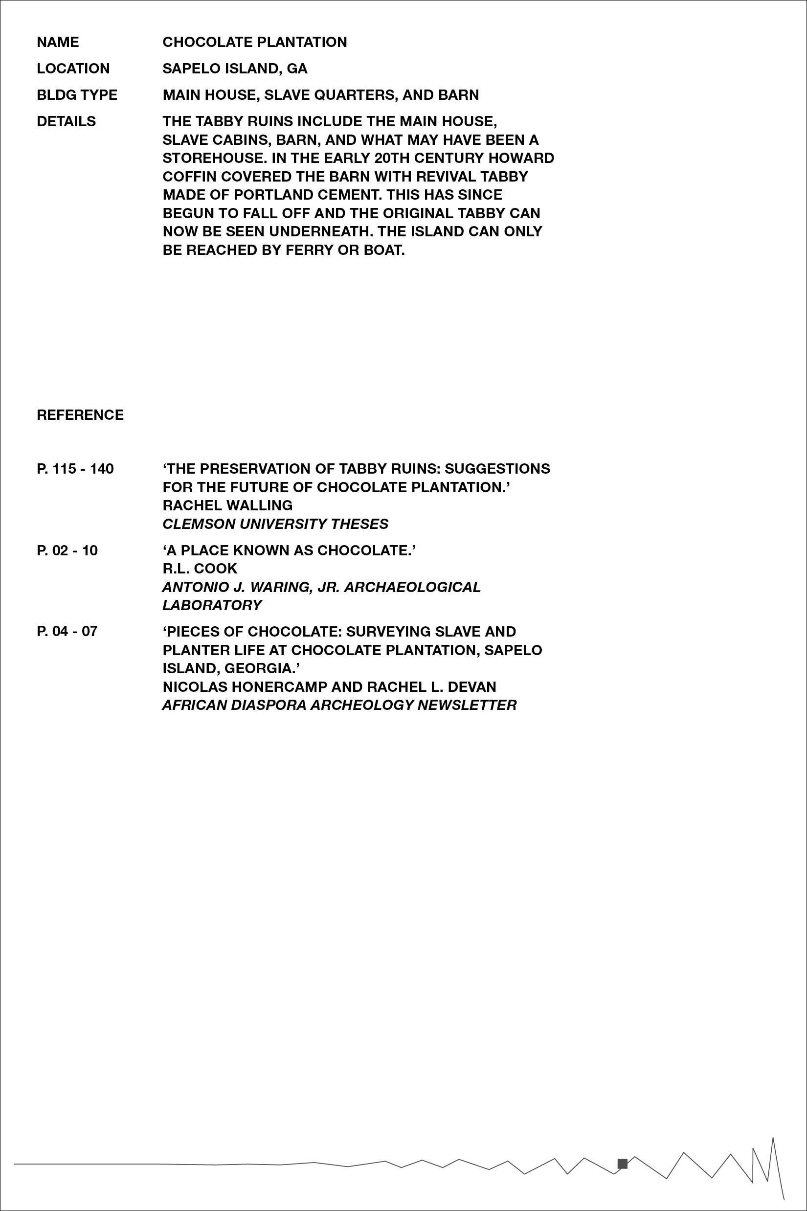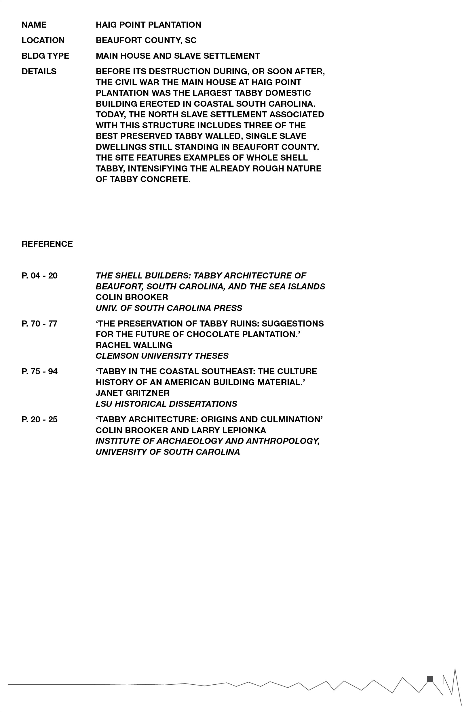 Inspired by Beverly Buchanan’s work with tabby concrete in several of her art installations, we chose to further research the history of the material in the South, specifically its ties to slavery and the subsequent meaning it lends to Buchanan’s work. Over the course of our research, we became primarily interested in the inherent rough and unfriendly texture of the material, and its devolution over time as it decays and its roughness intensified. The result was a collection of loose pages with no implied hierarchy or order — each an interpretation of a different tabby ruin’s scale of roughness — and a bibliography of references, emphasizing the hidden nature of the ruins, both in physical location and absence in historical texts.