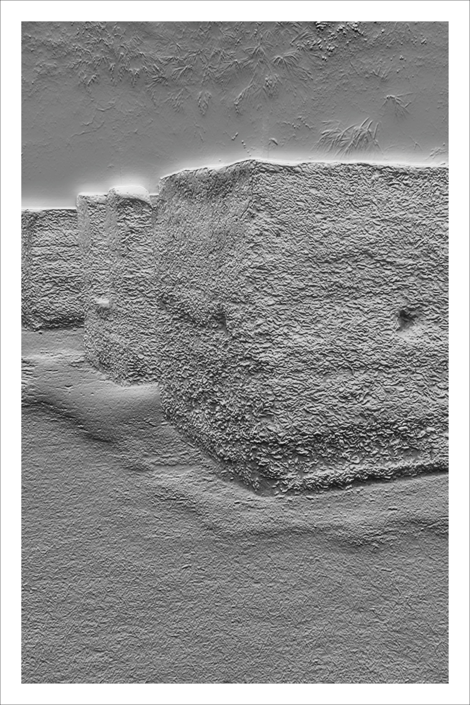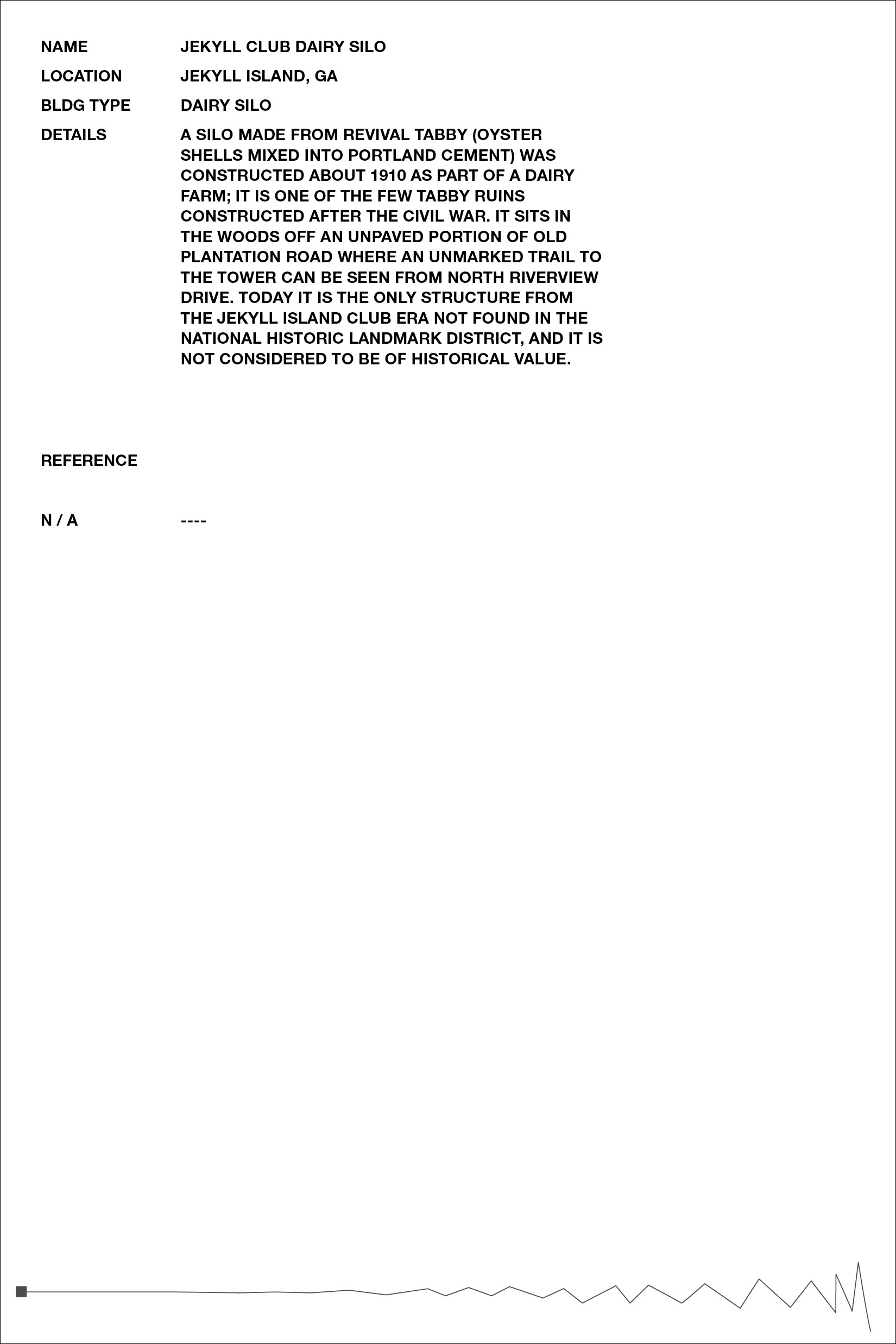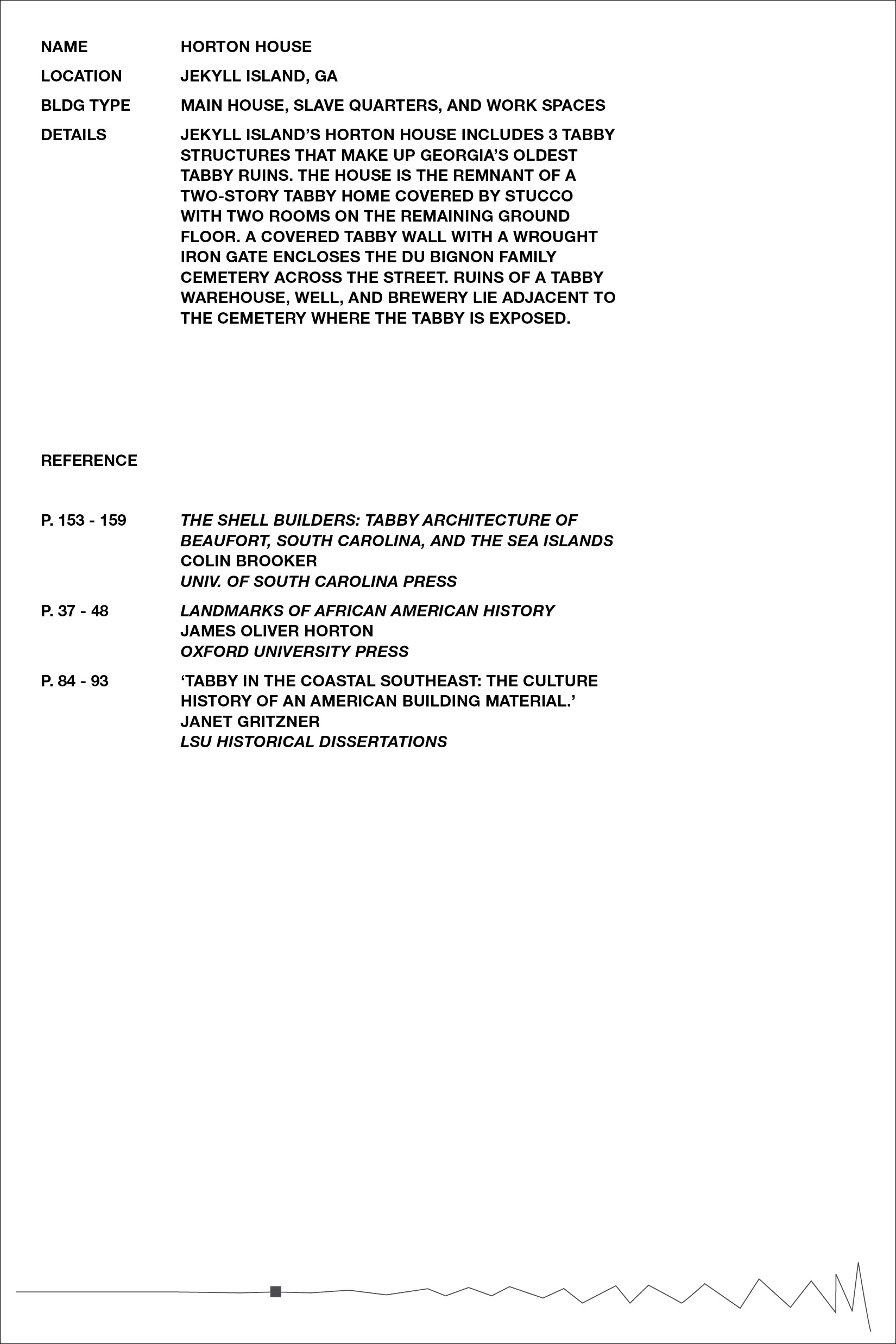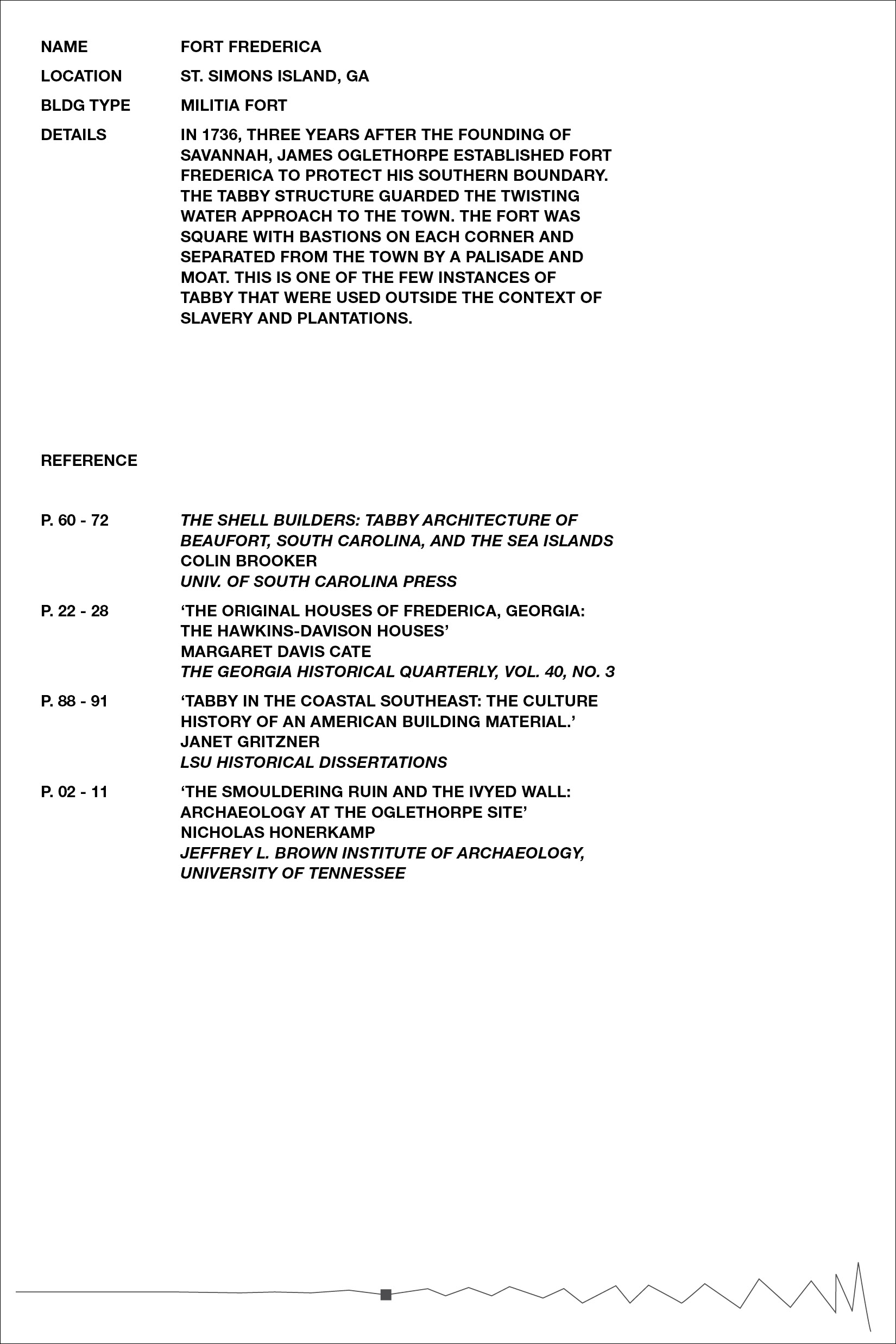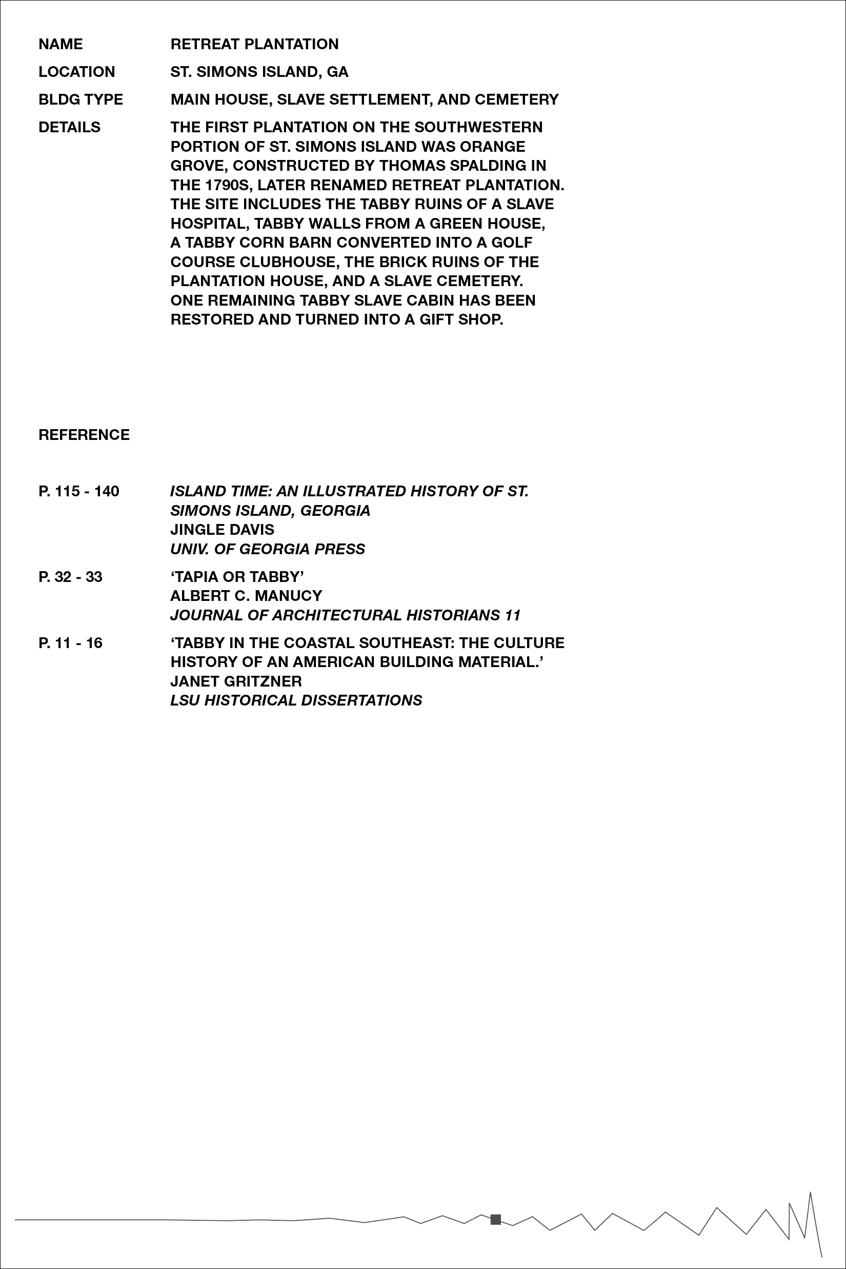 Inspired by Beverly Buchanan’s work with tabby concrete in several of her art installations, we chose to further research the history of the material in the South, specifically its ties to slavery and the subsequent meaning it lends to Buchanan’s work. Over the course of our research, we became primarily interested in the inherent rough and unfriendly texture of the material, and its devolution over time as it decays and its roughness intensified. The result was a collection of loose pages with no implied hierarchy or order — each an interpretation of a different tabby ruin’s scale of roughness — and a bibliography of references, emphasizing the hidden nature of the ruins, both in physical location and absence in historical texts.