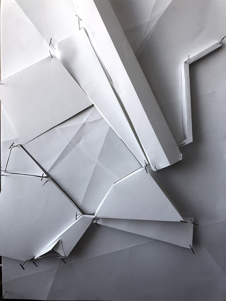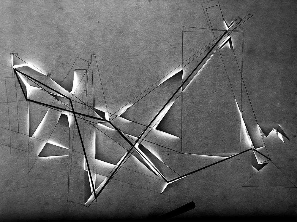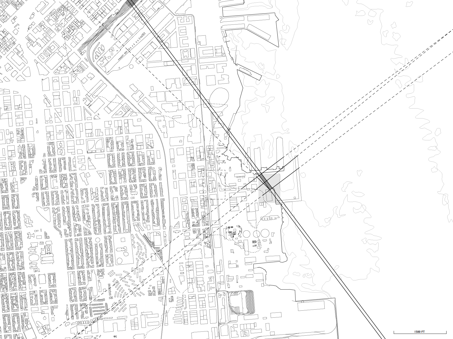 Beginning with drawing a still life composed of random pieces of wood and the occasional bottle, I was tasked with finding a unique perspective of the still life, trying to create an abstract two-dimensional representation of concrete three dimensional forms. I chose to focus on the light interaction and convergence points. Drawing on both sides of the paper, each side a different viewpoint of the still life, I developed a surface that used angled cuts to highlight a common line formed through intersection “hot spots”. These lines and cuts, coupled with the more central form, create the foundation for the earth work design in the Pier 70 site. These lines extend from the tidal garden zone, through the historic Tag Cathedral (Warehouse #6), ultimately leading back onto the land adjacent to the Cathedral. By looking at these lines as cuts into the earth, they propose elevation changes, which could serve as makeshift divides in the large open space to form smaller gathering areas for specific purposes.