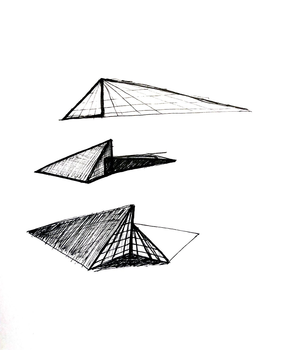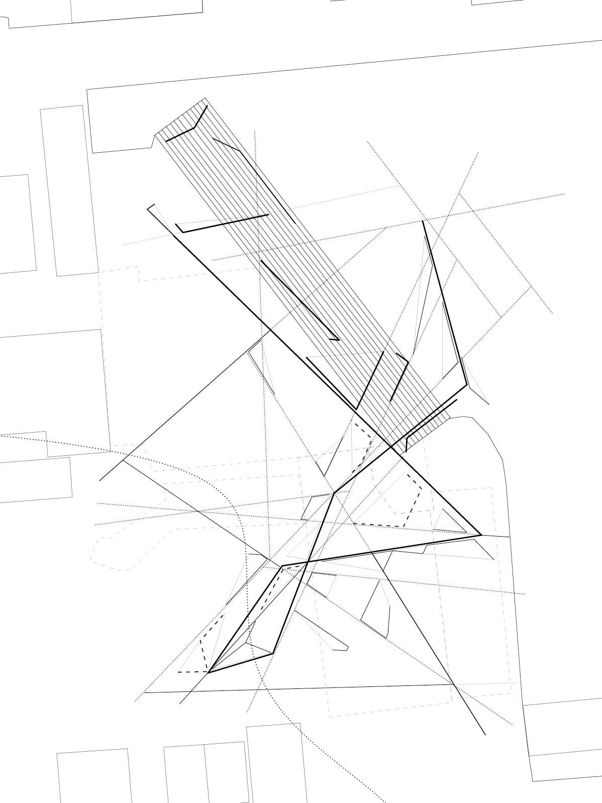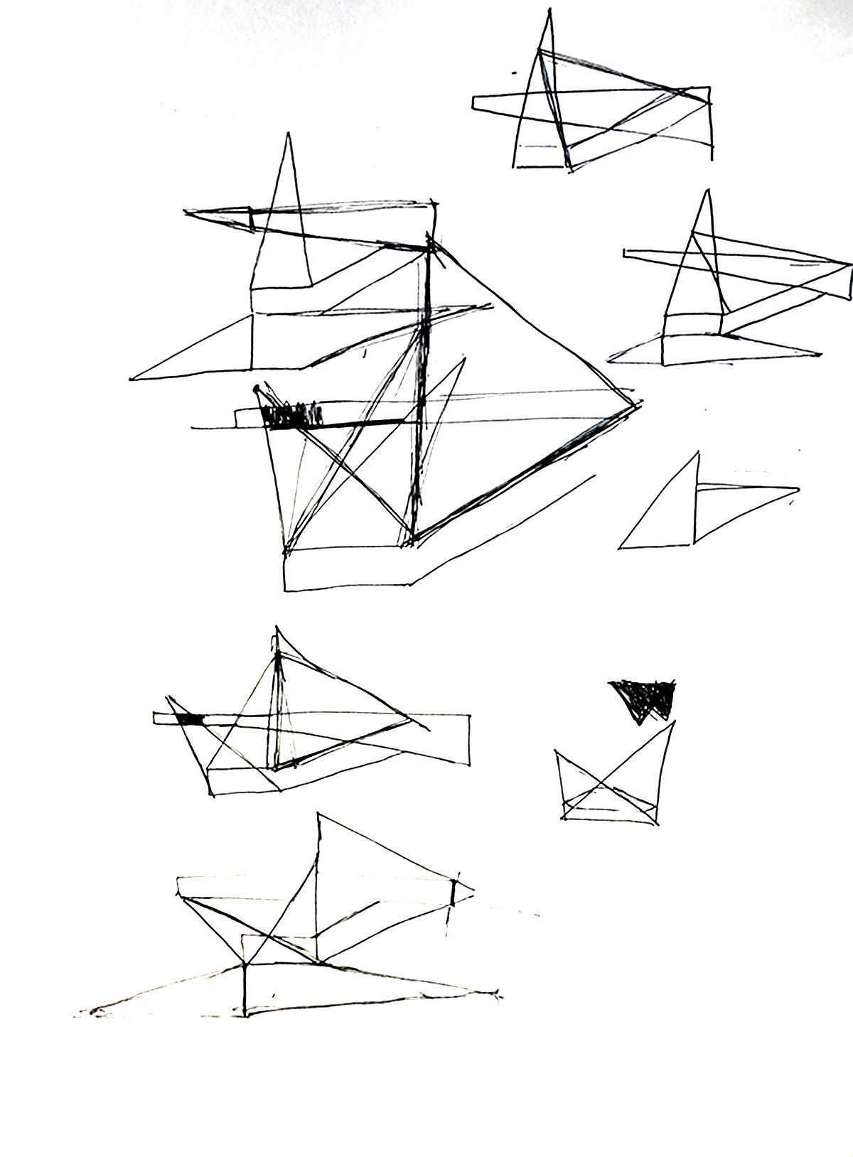 Beginning with drawing a still life composed of random pieces of wood and the occasional bottle, I was tasked with finding a unique perspective of the still life, trying to create an abstract two-dimensional representation of concrete three dimensional forms. I chose to focus on the light interaction and convergence points. Drawing on both sides of the paper, each side a different viewpoint of the still life, I developed a surface that used angled cuts to highlight a common line formed through intersection “hot spots”. These lines and cuts, coupled with the more central form, create the foundation for the earth work design in the Pier 70 site. These lines extend from the tidal garden zone, through the historic Tag Cathedral (Warehouse #6), ultimately leading back onto the land adjacent to the Cathedral. By looking at these lines as cuts into the earth, they propose elevation changes, which could serve as makeshift divides in the large open space to form smaller gathering areas for specific purposes.